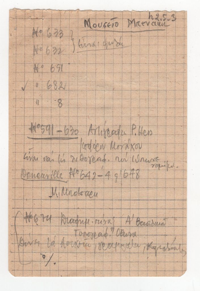 Αποκόμματα χαρτιού, 6 φφ, 12 x 8 εκ., στα ελληνικά, με χειρόγραφες σημειώσεις του Τώνη Σπητέρη, παρατηρήσεις του, για έργα στο Μουσείο Μπενάκη.