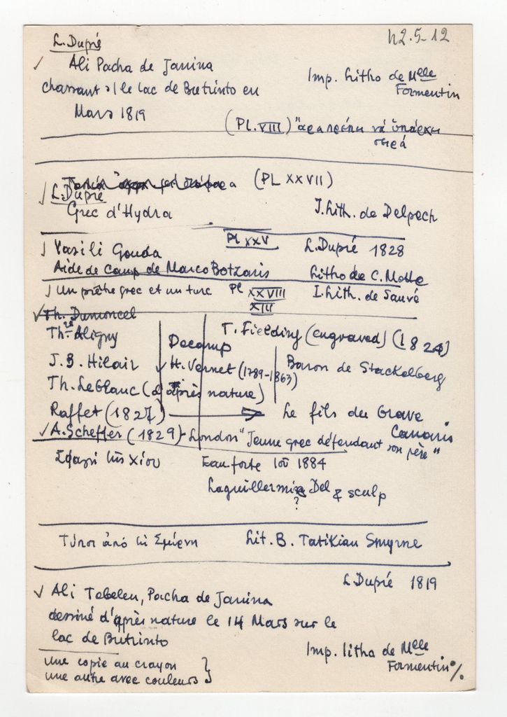 Χαρτόνι, 19 x 12,5 εκ., με χειρόγραφες σημειώσεις του Τώνη Σπητέρη στα γαλλικά και ελληνικά, με πληροφορίες για έργα, μεταξύ των οποίων λιθογραφίες, με θέμα την Ελληνική Επανάσταση. Αναγράφονται μεταξύ άλλων τα ονόματα των Dupré, Gericault, Scheffer.