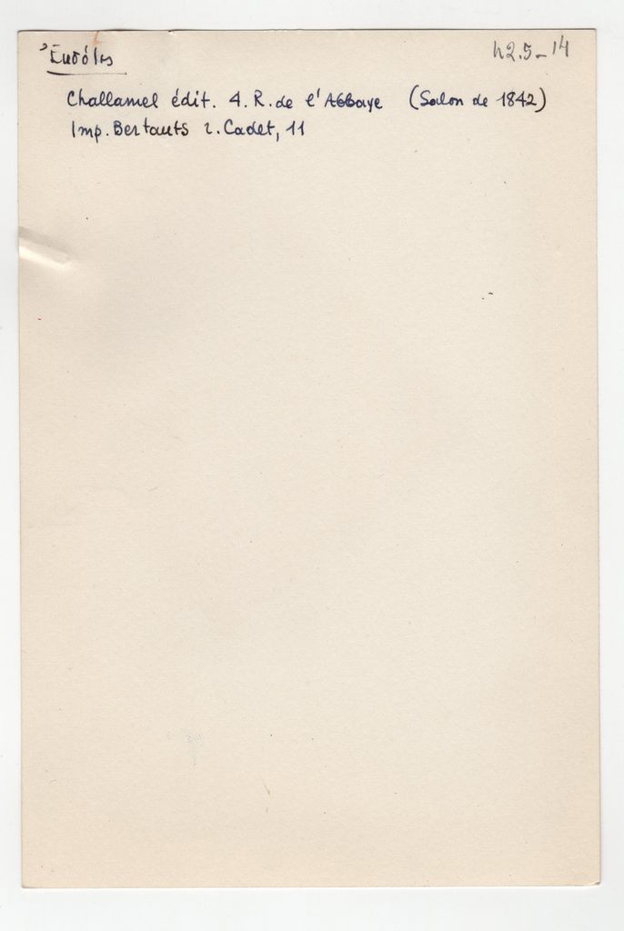 Απόκομμα χαρτονιού, 19 x 12.5 εκ., με χειρόγραφη σημείωση, με μπλε μελάνι στα γαλλικά, του Τώνη Σπητέρη. Αναγράφονται στοιχεία για εκδότη στο Παρίσι.