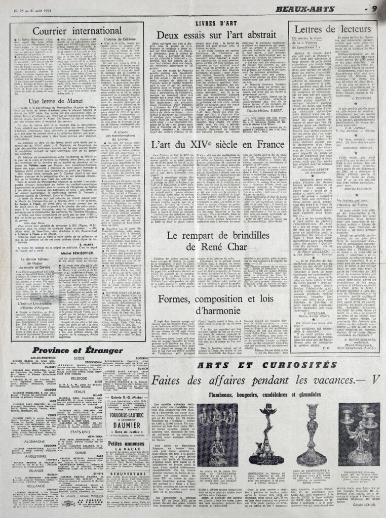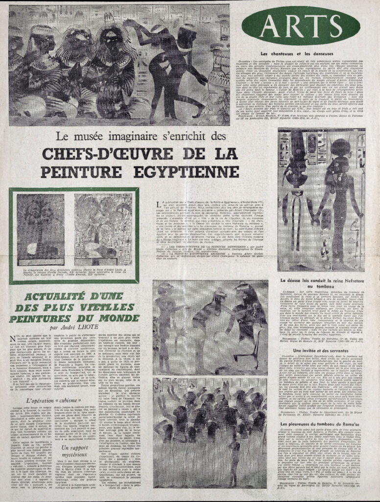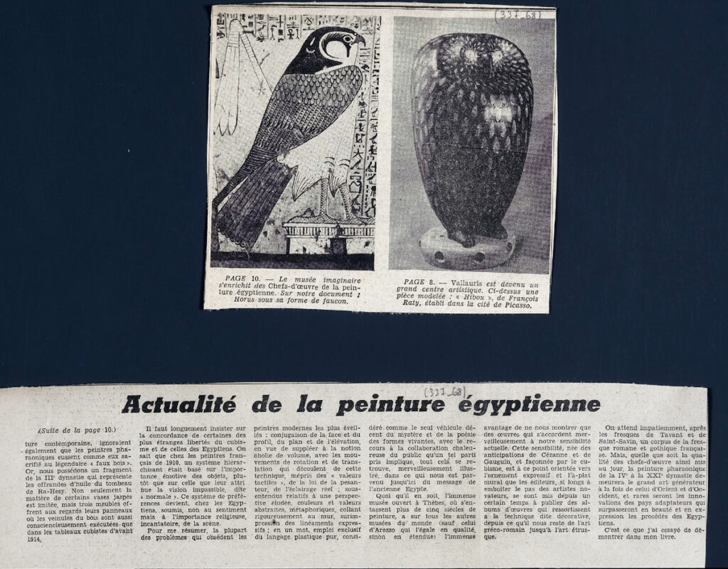 Απόκομμα του περιοδικού “Arts”, 29-31/08/1954, έντυπο, στα γαλλικά, χαρτί, τρία τμήματα διπλής όψης: 59×42,5 εκ., 10,5×30,5 εκ. και 13,5×15 εκ. Το απόσπασμα εικονογραφείται. Στο ίδιο απόκομμα: A. Lhote “Actualité d’ une des plus vieilles peintures du monde”.
