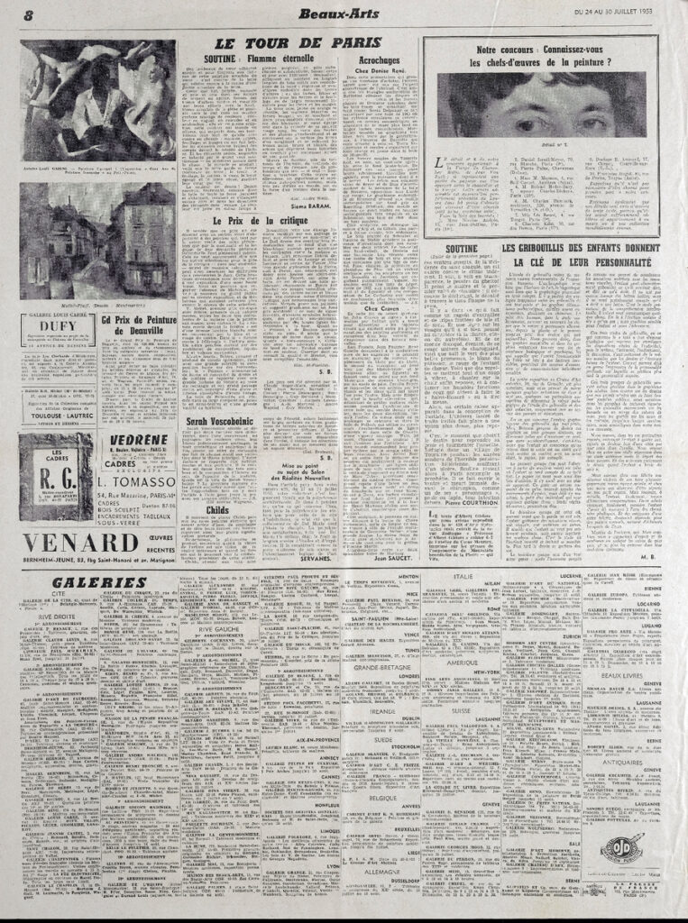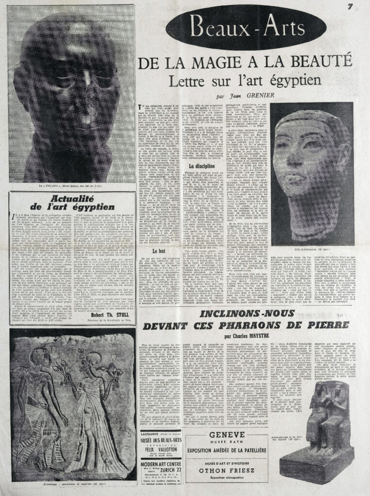 Απόκομμα του περιοδικού “Arts”, 24-30/07/1953, έντυπο, στα γαλλικά, χαρτί, διπλής όψης, 59×43,5 εκ., όπου δημοσιεύεται άρθρο για την αιγυπτιακή τέχνη. Το απόσπασμα εικονογραφείται. Στο ίδιο απόκομμα: Ch. Maystre “Inclinons-nous devant ces pharaons de Pierre”.