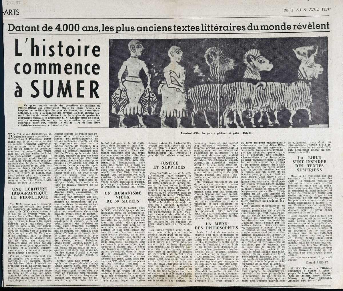 Απόκομμα του περιοδικού “Arts”, 03-09/04/1957, έντυπο, στα γαλλικά, χαρτί, διπλής όψης, 32×36 εκ., όπου δημοσιεύεται άρθρο για τον πολιτισμό των Σουμερίων. Το απόσπασμα εικονογραφείται.