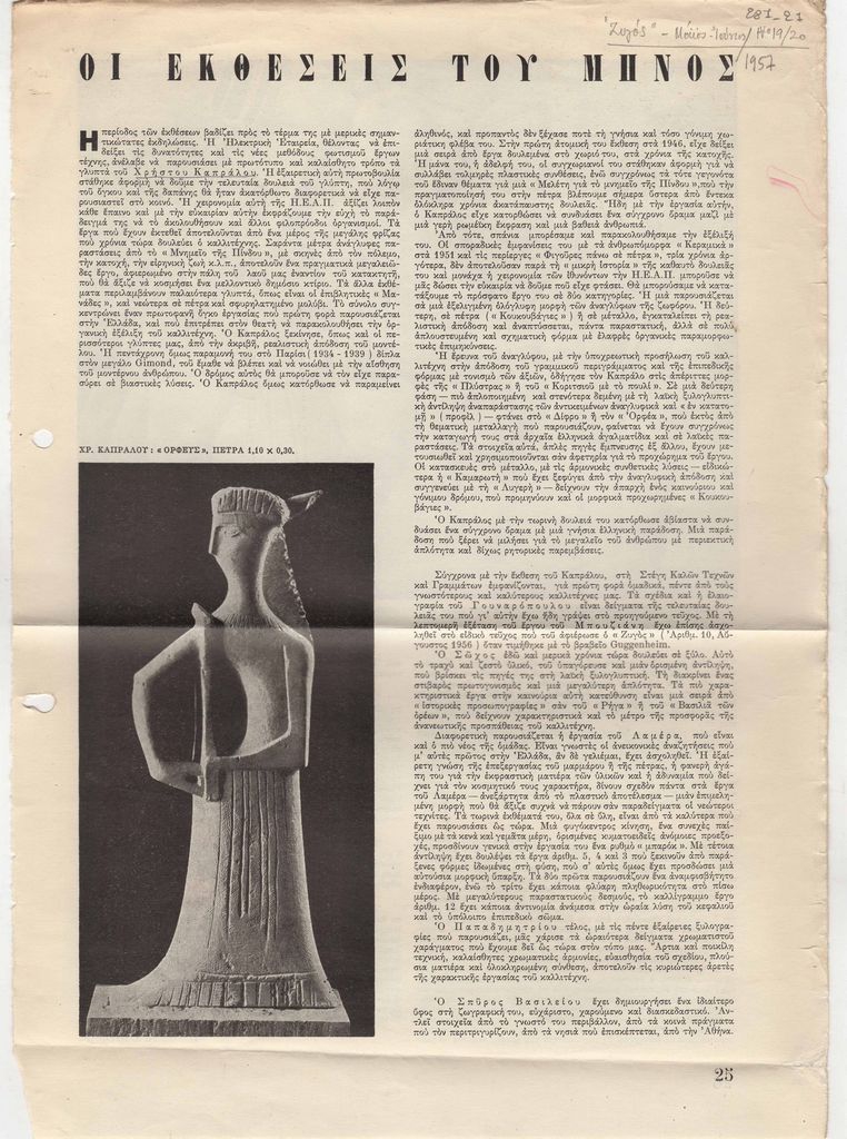 Απόκομμα, χαρτί, διπλής όψης, 34×24 εκ., στα ελληνικά. Δημοσίευση στήλης του Τώνη Σπητέρη στην οποία σχολιάζει εκθέσεις της περιόδου. Ειδικότερα, έκθεση Χ. Καπράλου στην Ηλεκτρική Εταιρεία Αθηνών και Πειραιώς, ομαδική έκθεση των Σώχου- Γουναρόπουλου- Λαμέρα- Μπουζιάνη-Παπαδημητρίου στην Στέγη Γραμμάτων και Τεχνών, Σ. Βασιλείου στον Ζυγό, Β. Σεμερτζίδη στον Παρνασσό, Α. Πετρίδη στον Παρνασσό, Κ. Ξενάκη στην γκαλερί Πέην, και κινεζικής τέχνης στον Ζυγό.