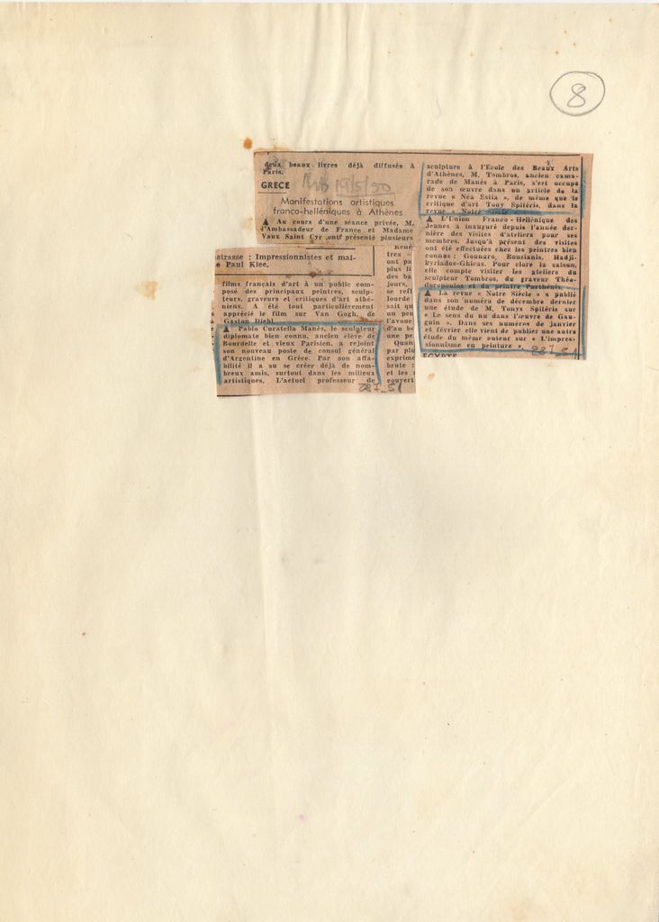 Απόκομμα, χαρτί, 2 τμχ, επικολλημένα σε λευκή κόλλα, 30×21 εκ, στα γαλλικά. Δημοσίευση στήλης του Τώνη Σπητέρη, στην οποία αναφέρεται σε εικαστικά της περιόδου. Ειδικότερα, σε προβολή φιλμ για τον Van Gogh σε σκηνοθεσία Gaston Diehl, την οποία διοργάνωσε σε κλειστό κύκλο η πρεσβεία της Γαλλίας στην Αθήνα, σε επίσκεψη του Pablo Curatella Manes στην Αθήνα, στην διοργάνωση επισκέψεων σε καλλιτεχνικά ατελιέ από τον Ελληνογαλλικό Σύνδεσμο και στη δημοσίευση διάλεξης του Τ. Σπητέρη με θέμα τη ζωγραφική του P. Gauguin από το περιοδικό ‘Ο Αιώνας μας’.