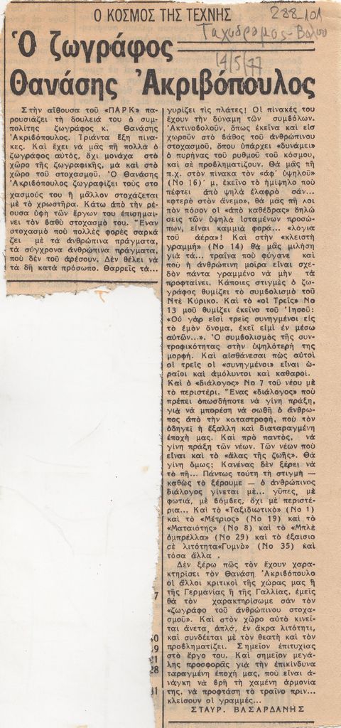 Απόκομμα, χαρτί ακανόνιστου μεγέθους, στα ελληνικά. Δημοσίευση κριτικής έκθεσης του Θανάση Ακριβόπουλου, η οποία διεξάγεται στο ξενοδοχείο Παρκ στον Βόλο σε διοργάνωση του Συλλόγου Φιλοτέχνων Βόλου.