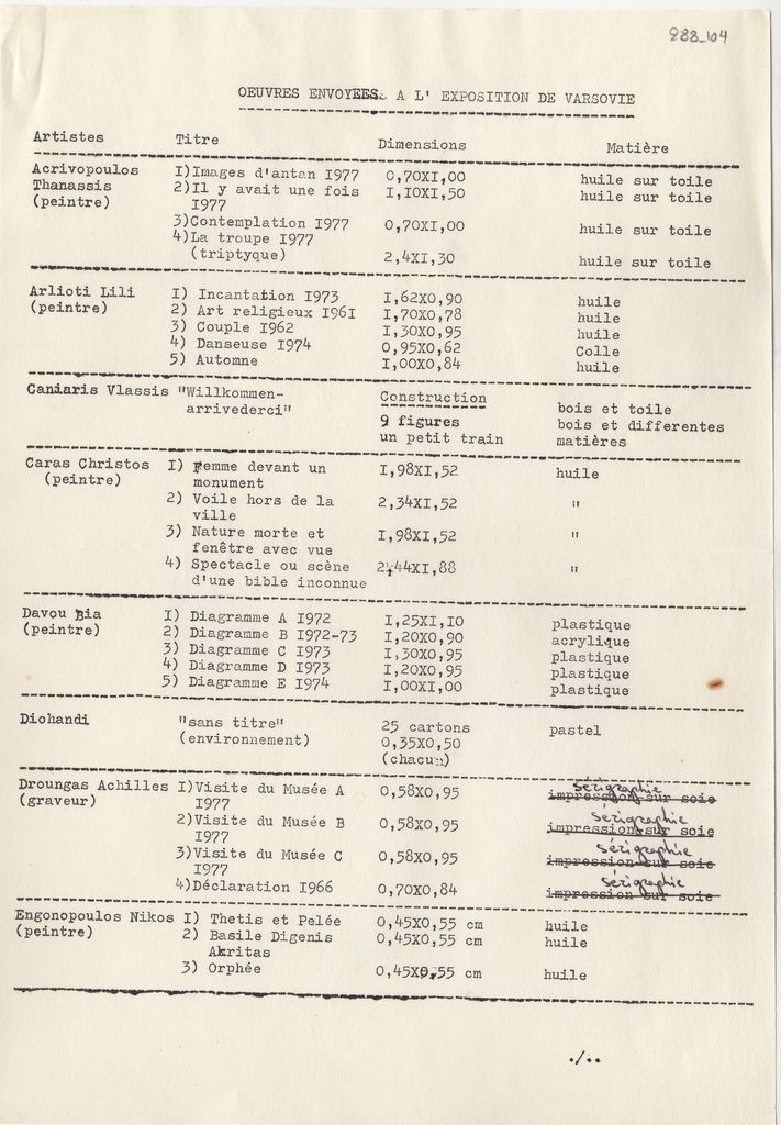 Δακτυλόγραφος κατάλογος, 3 φφ, 30×21 εκ., στα γαλλικά. Αναγράφονται έργα καλλιτεχνών τα οποία παρουσιάστηκαν σε ομαδική έκθεση νεοελληνικής τέχνης στην Βαρσοβία.