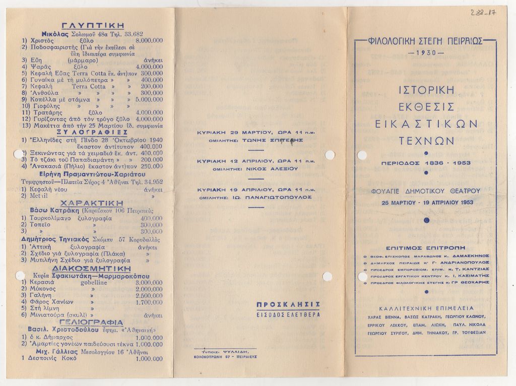 Έντυπο, χαρτόνι δίπτυχο, 21.5×10 εκ., στα ελληνικά, ομαδικής έκθεσης, στην Φιλολογική Στέγη Πειραιώς το 1953. Παρουσιάζονται και κοστολογούνται έργα των: Βολονάκη, Βώκου, Κούτση, Κρυστάλλη, Λιώκη, Οθωναίου, Οικονόμου, Παπαθεοδούλου, Χατζή, Αστρουλάκη, Βιέννα, Βαλσάμ, Βαρβέρη, Βασιλάκη, Γαβριηλίδη, Γαβριελάτου, Γιατζή, Δροσιάδου, Κατράκη, Κουκουλομάτη, Κουρή, Λαζόπουλου, Λεκού, Λιώκη, Μηλιάδη, Μήτσου, Νικολινάκου, Οικονομίδη, Παναγιωτάτου, Παχατουρίδη, Συρίγου, Τηνιακού, Τουφεξιάν, Δήμα- Τσίλλερ, Χαλαμπίδη, Χρηστοφή, Νικόλα, Χαριτάτου, Σφακιωτάκη, Χριστοδούλου, Γάλλια.