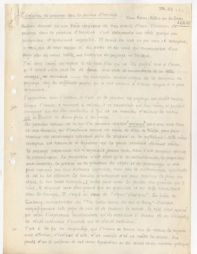 Χειρόγραφο κείμενο, χαρτί, 7 φφ, 29×21 εκ., στα γαλλικά. Προσχέδιο διάλεξης του Τώνη Σπητέρη στην Ελληνογαλλική Ένωση Νέων στην Αθήνα τον Φεβρουάριο 1955. Θέμα της διάλεξής του ‘Η εξέλιξη του τοπίου στη Δυτική ζωγραφική’.