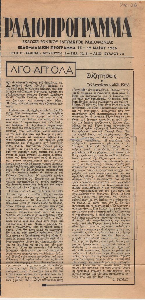 Απόκομμα περιοδικού, στα ελληνικά, χαρτί, 30×15 εκ., επικολλημένο σε λευκή κόλλα, 30×21 εκ. Κριτικής του Διονύσιου Ρώμα για ανοικτή συζήτηση που πραγματοποιήθηκε στο Γαλλικό Ινστιτούτο Αθηνών, με θέμα τη θέση του καλλιτέχνη στη σύγχρονη κοινωνία. Σχολιάζονται οι θέσεις του Ευάγγελου Παπανούτσου και Τώνη Σπητέρη.