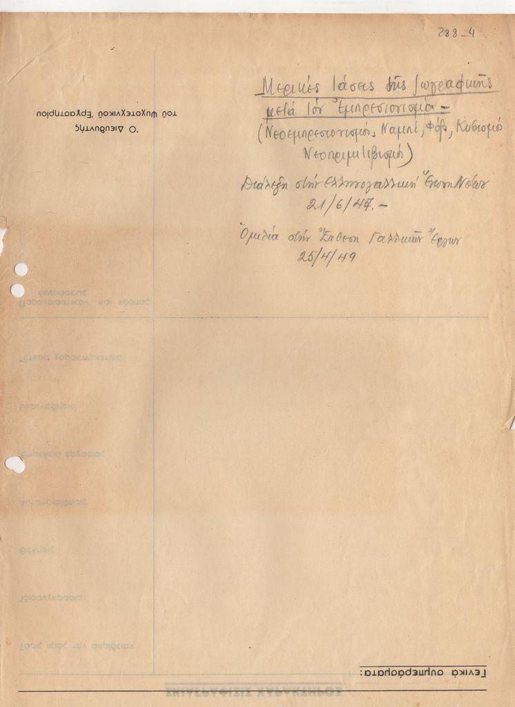 Χειρόγραφο κείμενο, χαρτί, 28 φφ, 30×21, 24×21 και 19×14 εκ., στα ελληνικά. Προσχέδιο ομιλίας του Τώνη Σπητέρη με θέμα τις τάσεις της ζωγραφικής μετά το κίνημα του ιμπρεσιονισμού (Νεοεμπρεσιονισμός, Ναμπί, Φοβ, Κυβισμός, Νεοπριμιτιβισμός). Πραγματοποίησε διαλέξεις στην Ελληνογαλλική ένωση νέων Πειραιά και σε έκθεση γαλλικής τέχνης το 1949.