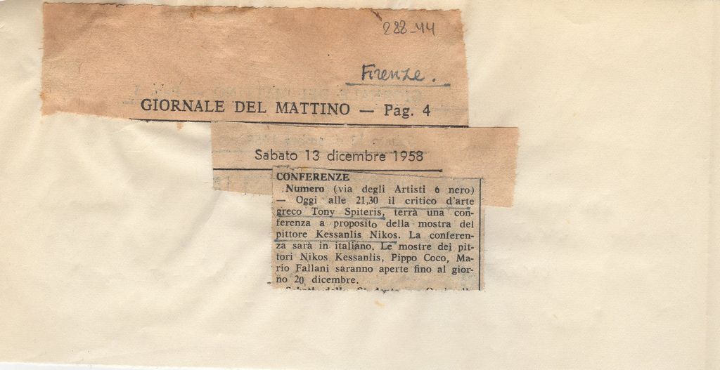 Απόκομμα, χαρτί επικολλημένο σε λευκή κόλλα, 9×22 εκ., στα ιταλικά. Δημοσίευση αναγγελίας διάλεξης του Τώνη Σπητέρη για τον Νίκο Κεσσανλή στην Φλωρεντία, στο πλαίσιο συμμετοχής του σε ομαδική έκθεση στην γκαλερί Numero.