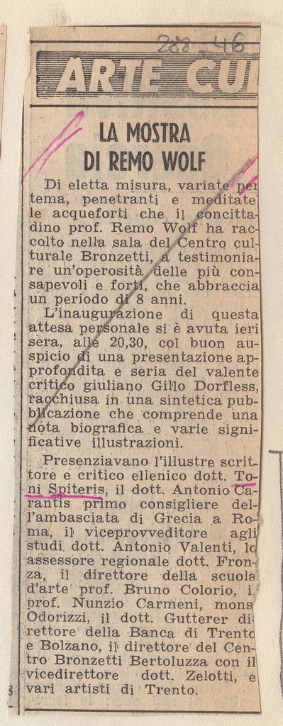 Απόκομμα, χαρτί επικολλημένο σε λευκή κόλλα, 30×21 εκ., στα ιταλικά. Δημοσίευση άρθρου στο οποίο σχολιάζεται έκθεση του Remo Wolf και ομιλία/ διάλεξη του Τώνη Σπητέρη για την ελληνική τέχνη στο Centro Culturalle Bronzetti στο Trento.