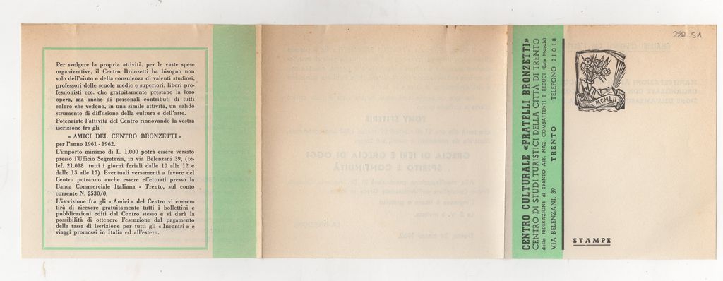 Πρόσκληση, χαρτί δίπτυχο, 12×12 εκ., στα ιταλικά, σε διάλεξη του Τώνη Σπητέρη για την ελληνική τέχνη “Grecia di ieri e Grecia di oggi spirito e continuità”, στο πολιτιστικό κέντρο ‘Bronzetti’ στο Trento. Στο έντυπο αναφορά σε έκθεση του Remo Wolf.