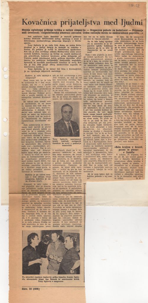 Απόκομμα, χαρτί ακανόνιστου μεγέθους επικολλημένο σε λευκή κόλλα, 30×21 εκ., στα σλοβενικά(;). Συνέντευξη του Τώνη Σπητέρη στο έντυπο, με αφορμή τη συμμετοχή του στη διοργάνωση του συμποσίου γλυπτικής ‘Forma Viva’ στην Kostanjevica.