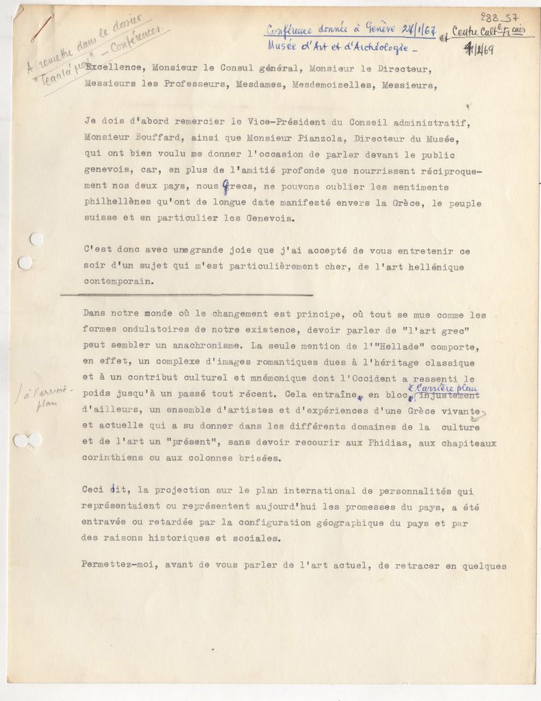 Δακτυλόγραφο κείμενο, χαρτί, 16 φφ, 30×21 εκ., στα γαλλικά. Προσχέδιο διάλεξης του Τώνη Σπητέρη με θέμα την νεοελληνική τέχνη, την οποία έδωσε στο Αρχαιολογικό Μουσείο Γενεύης, στο πλαίσιο ομαδικής έκθεσης νεοελληνικής τέχνης, τον Ιανουάριο 1967. Κάνει μια αναδρομή στην πορεία και εξέλιξη της νεοελληνικής τέχνης και αναφέρεται σε σημαντικούς σύγχρονους καλλιτέχνες.
