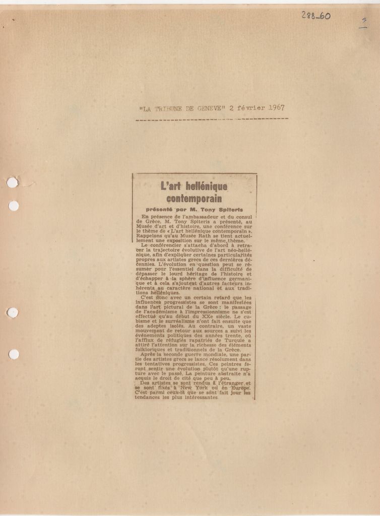 Φωτοαντίγραφο, χαρτί, 30×21 εκ., στα γαλλικά. Δημοσίευση άρθρου του Τώνη Σπητέρη στο οποίο αναφέρεται σε διάλεξή του, που έδωσε στο αρχαιολογικό μουσείο της Γενεύης, με θέμα την νεοελληνική τέχνη, στο πλαίσιο ομαδικής έκθεσης σύγχρονης ελληνικής τέχνης στο μουσείο Rath της πόλης.