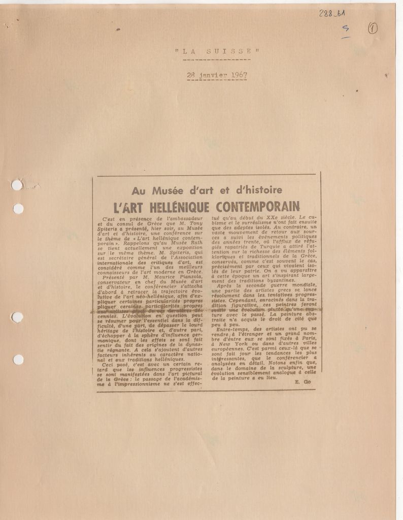 Φωτοαντίγραφο, χαρτί, 30×21 εκ., στα γαλλικά. Δημοσίευση άρθρου στο οποίο σχολιάζεται διάλεξη του Τώνη Σπητέρη με θέμα την ελληνική τέχνη, η οποία πραγματοποιήθηκε στο αρχαιολογικό μουσείο της Γενεύης.