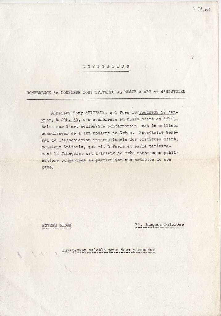 Δακτυλόγραφη πρόσκληση, χαρτί, 30×21 εκ., στα γαλλικά, σε διάλεξη του Τώνη Σπητέρη, με θέμα την νεοελληνική τέχνη, στο αρχαιολογικό μουσείο της Γενεύης.