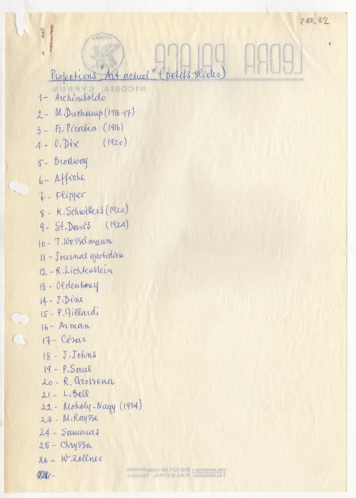 Χειρόγραφος κατάλογος του Τώνη Σπητέρη, χαρτί, 26×18.5 εκ., στα γαλλικά. Αναγράφονται ονόματα καλλιτεχνών, έργα των οποίων παρουσιάστηκαν σε διαφάνειες στο πλαίσιο διάλεξης του τεχνοκριτικού, με θέμα τη σύγχρονη τέχνη.