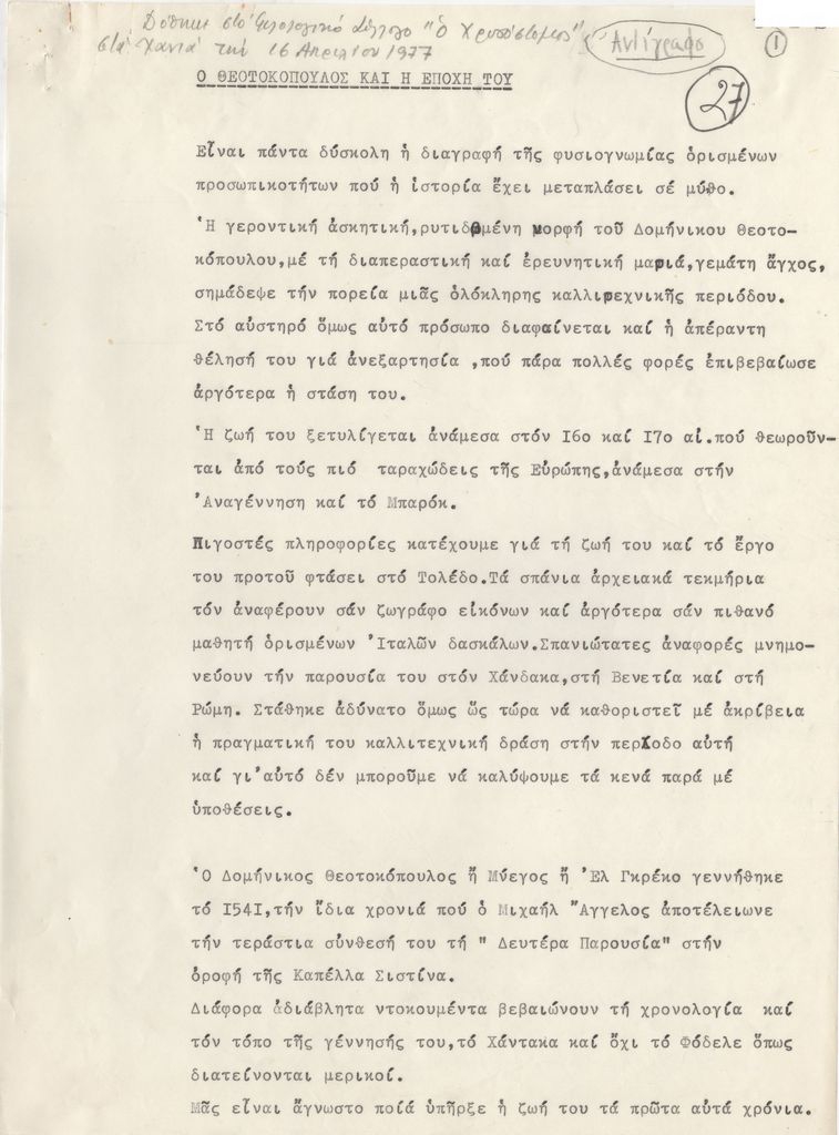 Δακτυλόγραφος κατάλογος, χαρτί, 15 φφ, 30×21 εκ., στα ελληνικά. Προσχέδιο διάλεξης του Τώνη Σπητέρη για τον Δομήνικο Θεοτοκόπουλο και την εποχή του, η οποία δόθηκε στον Φιλολογικό Σύλλογο ‘Ο Χρυσόστομος’ στα Χανιά τον Απρίλιο 1977.