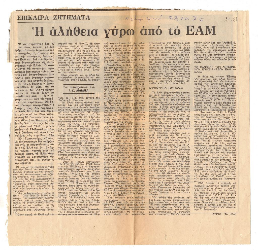 Απόκομμα, έντυπο, στα ελληνικά, χαρτί, διπλής όψης, 26,5×27 εκ. Εντάσσεται στην στήλη “Επίκαιρα Ζητήματα”. Πάνω από τον τίτλο, επιγραφή, στα ελληνικά. Στο ίδιο απόκομμα: διαφήμιση.