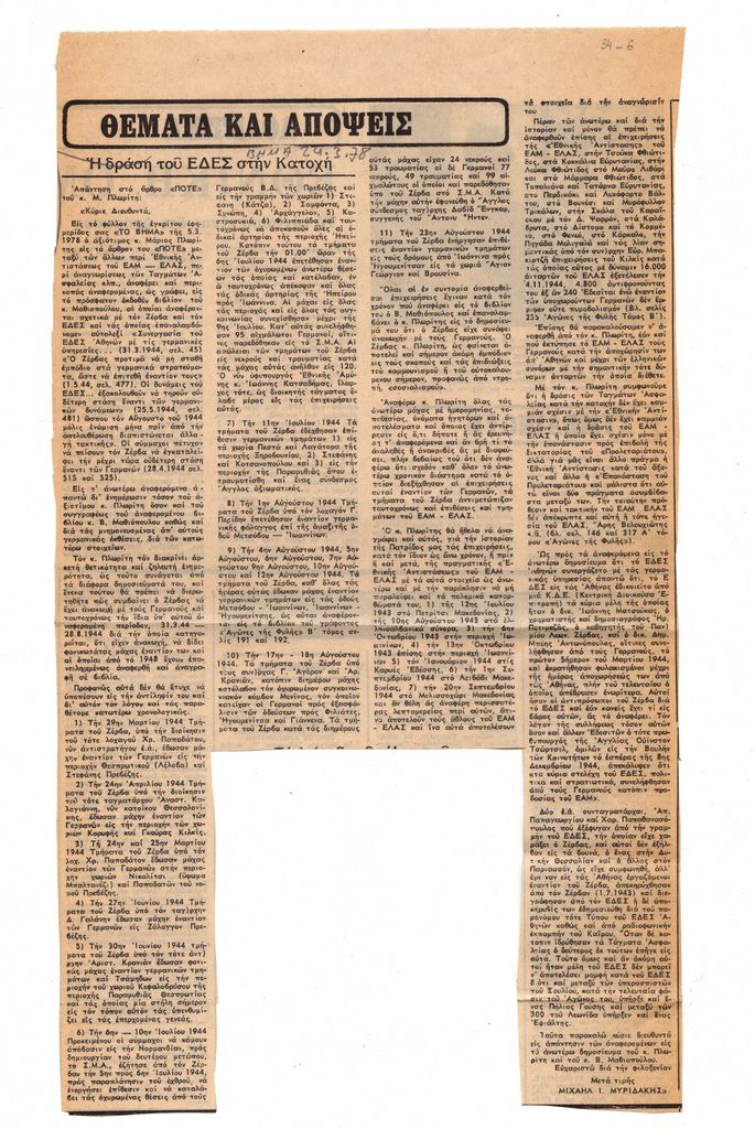 Απόκομμα, έντυπο, στα ελληνικά, χαρτί, διπλής όψης, 35×20,5 εκ. Κάτω από τον τίτλο, επιγραφή, στα ελληνικά. Στο ίδιο απόκομμα: αθλητική επικαιρότητα και κοινωνικά νέα.