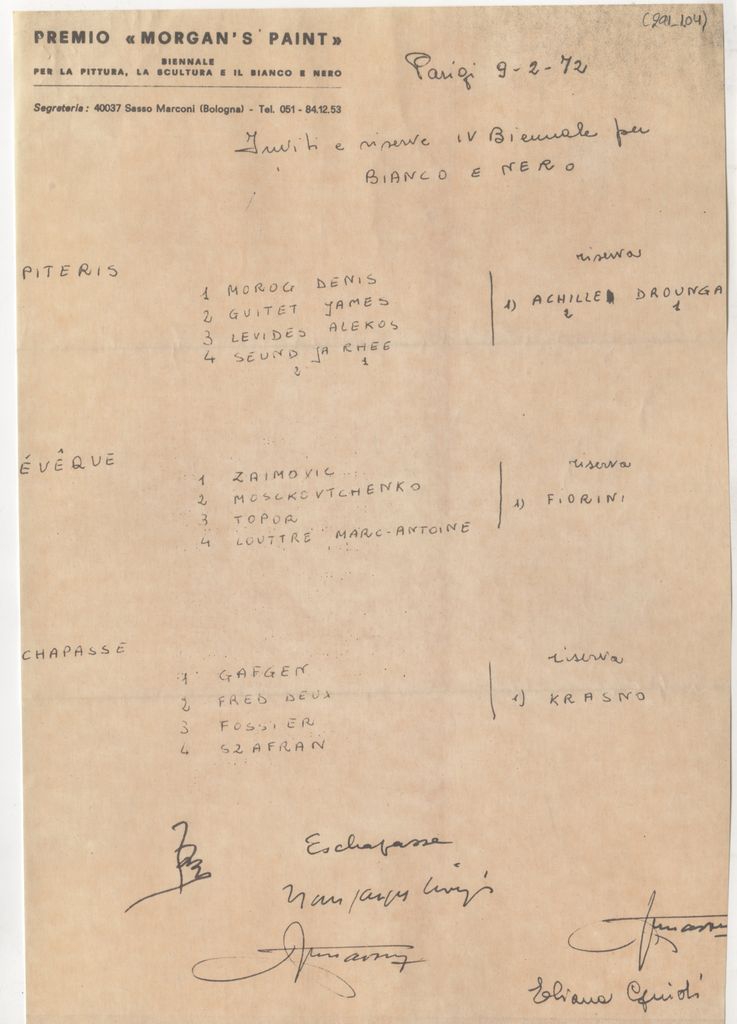 Φωτοαντίγραφο χειρόγραφου καταλόγου, χαρτί, 3 φφ, 30×21 εκ., στα ιταλικά. Φέρει τον τίτλο “Inviti e riserve IV Biennale per Pittura” και δίνεται λίστα καλλιτεχνών σε αντιστοιχία με τους τεχνοκριτικούς. Αναφέρεται σε προτάσεις ή επιλογές καλλιτεχνών από τους επιτρόπους της 4ης Μπιενάλε Morgan’s Paint.