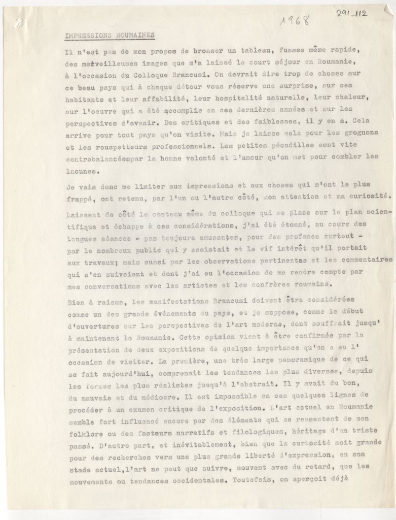 Δακτυλόγραφο κείμενο του Τώνη Σπητέρη, χαρτί, 3 φφ, 30×21 εκ., στα γαλλικά. Αναφέρεται σε εντυπώσεις του από την επίσκεψή του στη Ρουμανία, μεταφέρει σκέψεις και σχόλια από τη συμμετοχή του σε διεθνές συνέδριο για τον Constatin Brancusi που πραγματοποιήθηκε στην Ρουμανία το 1967.