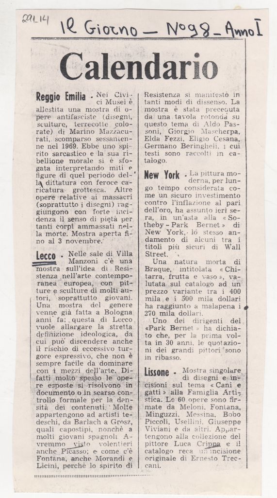 Φωτοαντίγραφο, χαρτί, 20×10 εκ., στα ιταλικά. Δημοσίευση στήλης του εντύπου, στην οποία αναφέρονται εικαστικά δρώμενα της περιόδου. Ανάμεσα σε αυτά, θεματική έκθεση στο Lecco της Ιταλίας, με θέμα την Αντίσταση. Δίνονται λεπτομέρειες για το περιεχόμενό της και για στρογγυλή τράπεζα που πραγματοποιείται στο πλαίσιο της έκθεσης με συμμετέχοντες τους Aldo Passoni, Giorgio Mascherpa, Elda Fezzi, Eligio Cesana, Germano Beringheli.