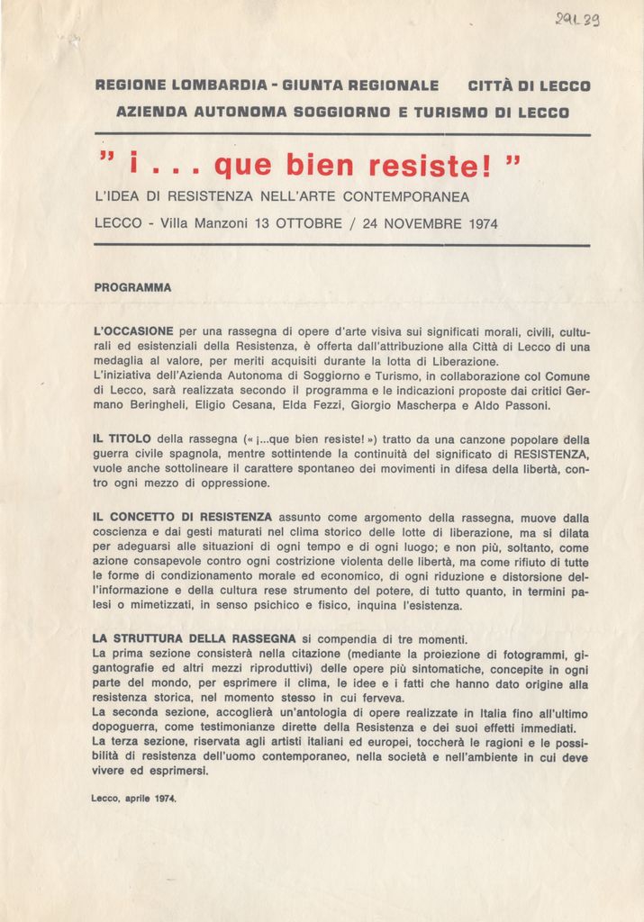 Έντυπο, χαρτί, 28×21 εκ., στα ιταλικά. Πρόγραμμα της έκθεσης με τίτλο “i… que bien resiste!” (διεθνή αντιστασιακή έκθεση), που διοργανώνεται στο Lecco της Ιταλίας. Αναγράφονται λεπτομέρειες για την διοργάνωση.