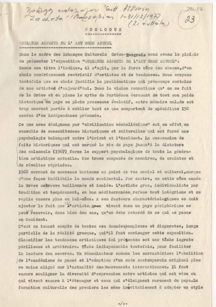 Δακτυλόγραφο κείμενο του Τώνη Σπητέρη, χαρτί, 3 φφ, 30×21 εκ., στα γαλλικά. Χρησιμοποιήθηκε ως πρόλογος του καταλόγου ομαδικής έκθεσης Ελλήνων καλλιτεχνών στην Βαρσοβία το 1977.