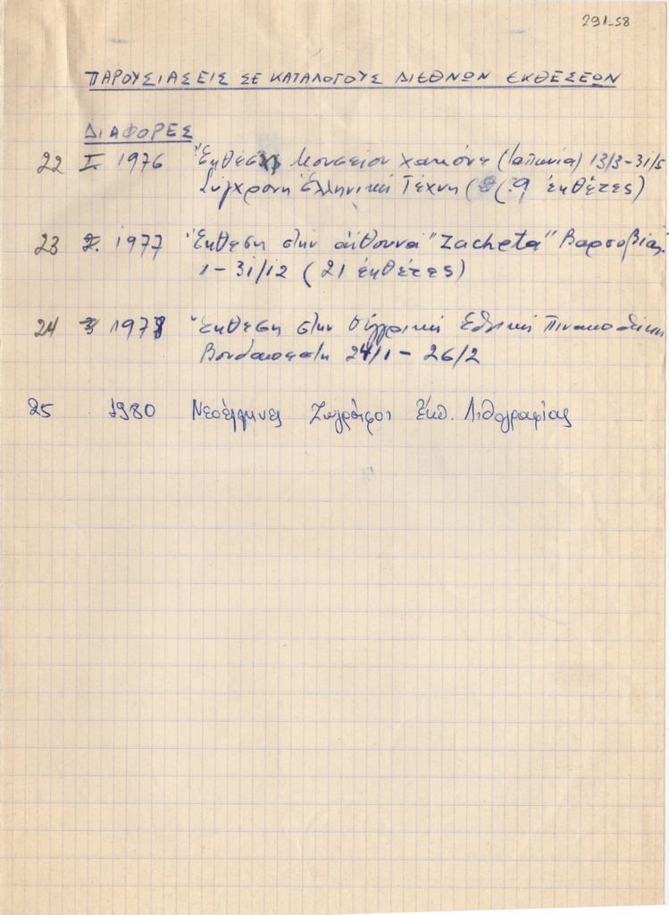 Αντίγραφο χειρόγραφου καταλόγου, χαρτί, 30×21 εκ., στα ελληνικά. Αναγράφονται συμμετοχές του Τώνη Σπητέρη με κείμενά του σε διεθνείς εκθέσεις ελληνικής τέχνης κατά το διάστημα 1976-1980.