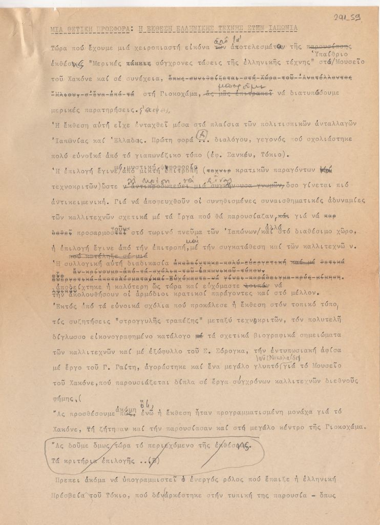 Δακτυλόγραφο προσχέδιο κειμένου του Τώνη Σπητέρη, χαρτί, 2 φφ, 30×21 εκ., στα ελληνικά. Αναφέρεται στην επιτυχία της έκθεσης νεοελληνικής τέχνης στο Μουσείο Hakone της Ιαπωνίας.
