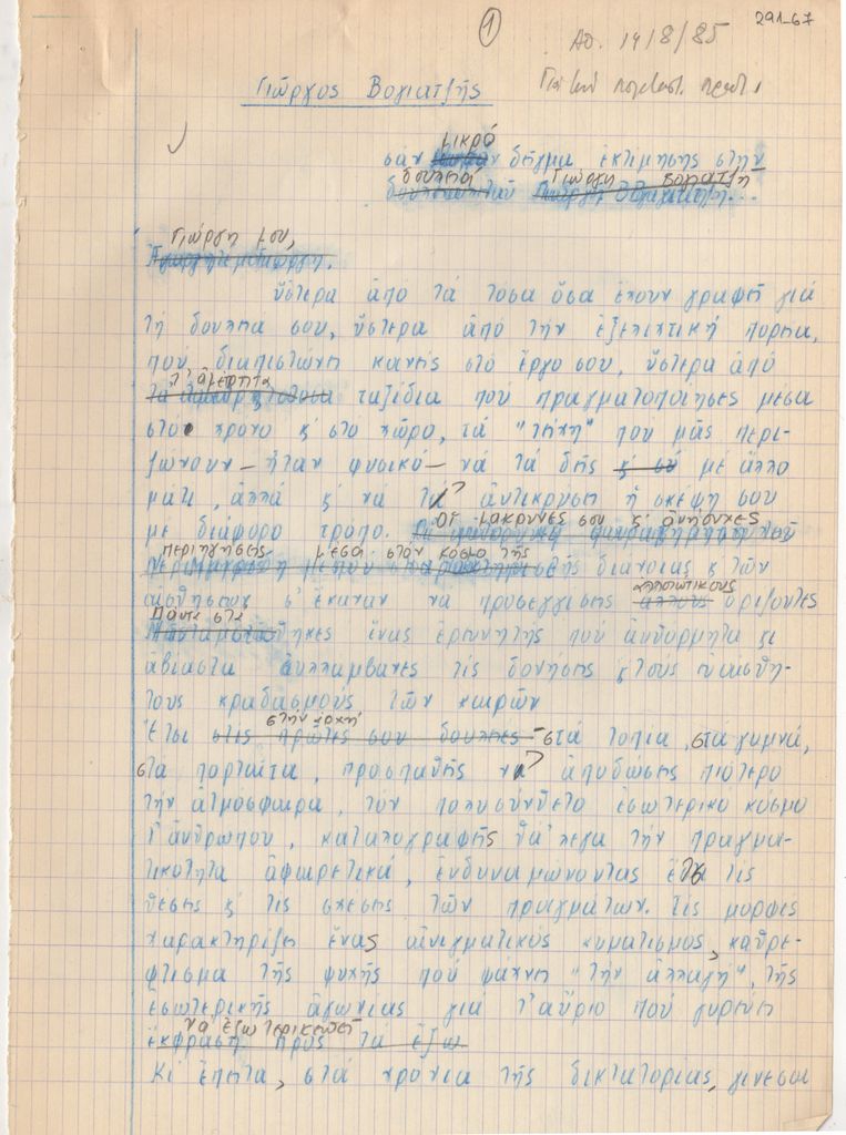 Αντίγραφο χειρόγραφου κειμένου του Τώνη Σπητέρη με ημερομηνία 14/08/1985, χαρτί, 3 φφ, 30×21 εκ., στα ελληνικά για τον Γιώργο Βογιατζή. Αναφέρεται στη ζωή και στο έργο του καλλιτέχνη.