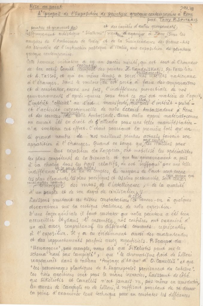 Χειρόγραφο κείμενο του Τώνη Σπητέρη, χαρτί, 2 φφ, στα γαλλικά. Σχολιάζεται ομαδική έκθεση Ελλήνων καλλιτεχνών, η οποία διεξάγεται στην Εθνική Πινακοθήκη της Ρώμης.