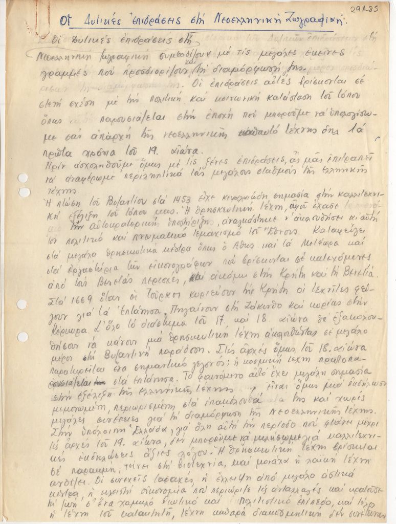 Χειρόγραφο κείμενο του Τώνη Σπητέρη, χαρτί, 30×21 εκ., 8 φφ, στα ελληνικά. Αναφέρεται στη δυτική επίδραση στην νεοελληνική ζωγραφική.