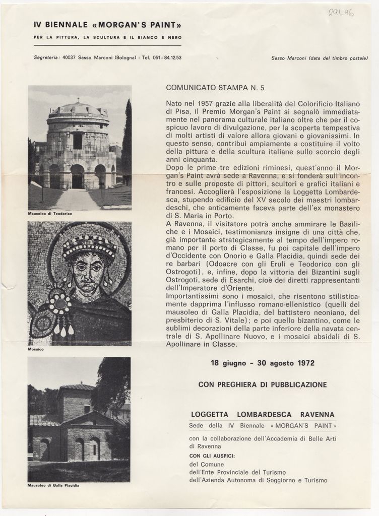 Δελτίο τύπου (αρ. 5), χαρτί, 30×21 εκ., στα ιταλικά, της 4ης Μπιενάλε Morgan’ s Paint, που πραγματοποιείται στην Ραβέννα. Αναγράφονται πληροφορίες για την πολιτιστική πλευρά της πόλης και αξιοθέατα που μπορεί να επισκεφθεί ο ενδιαφερόμενος.