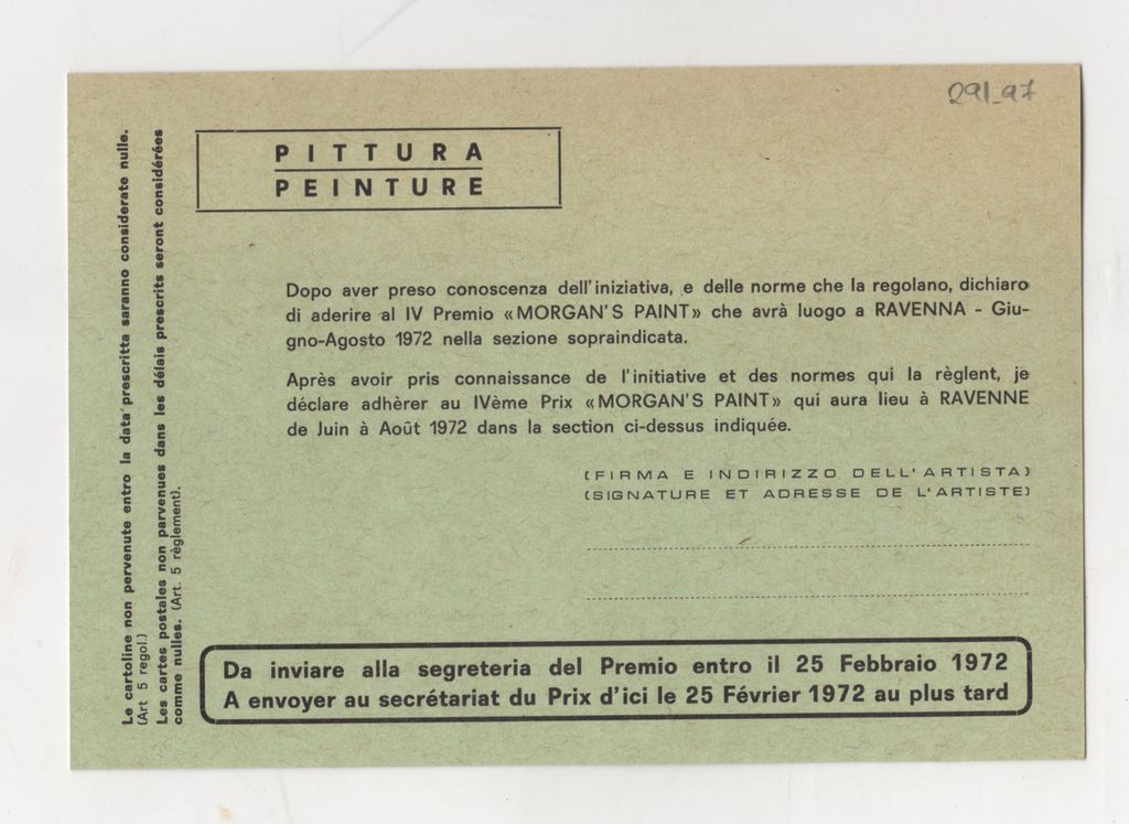 Έντυπο, χαρτόνι, 11×15.5 εκ., στα γαλλικά. Δελτίο συμμετοχής στην 4η Μπιενάλε Morgan’s Paint, η οποία διεξάγεται στην Ραβέννα.