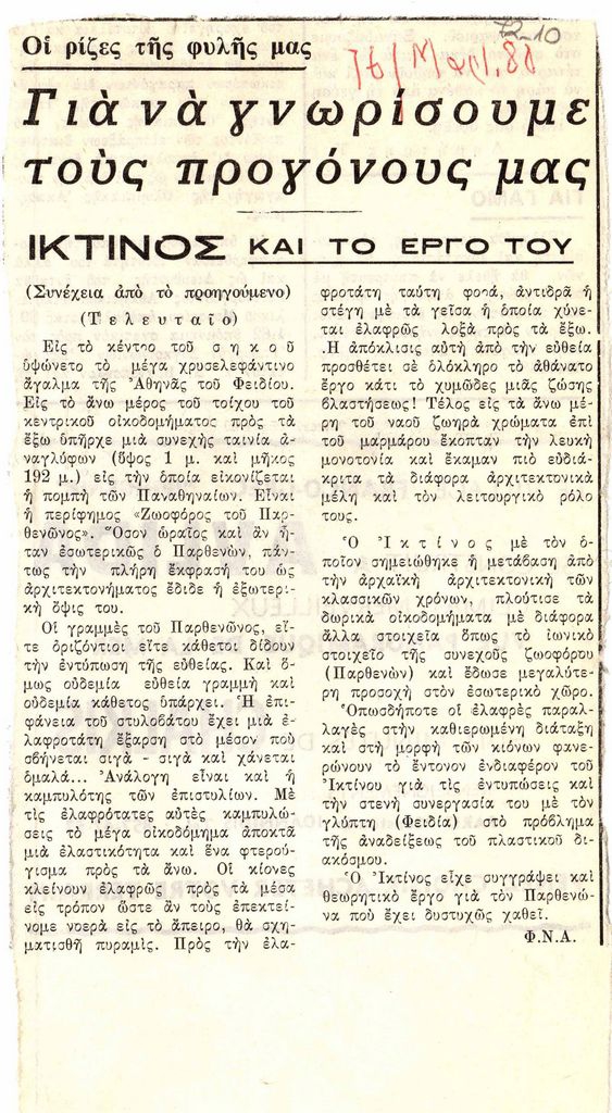 Απόκομμα, χαρτί, στα ελληνικά. Δημοσίευση άρθρου το οποίο αναφέρεται στον αρχιτέκτονα της αρχαιότητας Ικτίνο.