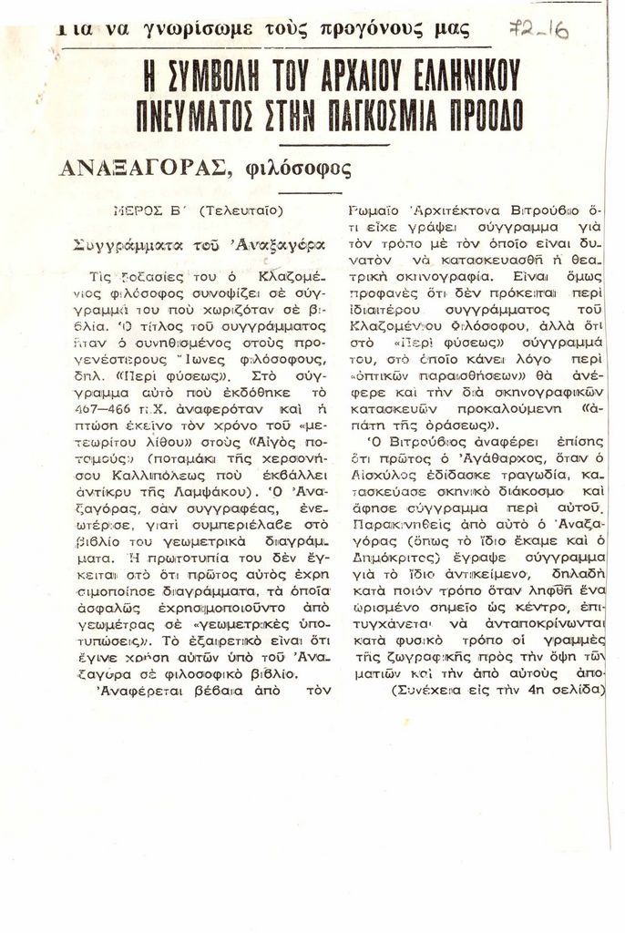 Απόκομμα, χαρτί, 2 φφ, στα ελληνικά. Δημοσίευση άρθρου το οποίο αναφέρεται στον φιλόσοφο της αρχαιότητας, Αναξαγόρα. Δίνονται λεπτομέρειες για τη ζωή του.