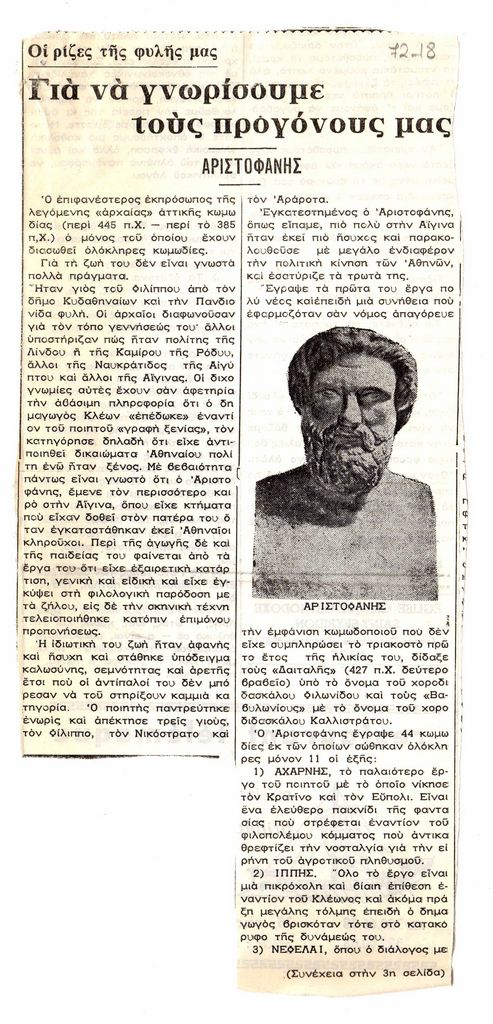 Απόκομμα, χαρτί, 3 φφ, στα ελληνικά. Δημοσίευση άρθρου το οποίο αναφέρεται στο αρχαίο ποιητή, Αριστοφάνη.