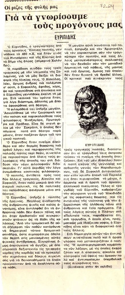 Απόκομμα, χαρτί, 2 φφ, στα ελληνικά. Δημοσίευση άρθρου το οποίο αναφέρεται στον αρχαίο τραγικό ποιητή, Ευριπίδη.