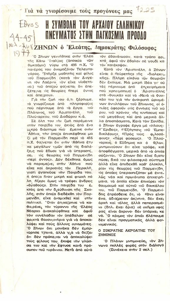Απόκομμα, χαρτί, 21×12 εκ., στα ελληνικά. Δημοσίευση άρθρου το οποίο αναφέρεται στον προσωκρατικό φιλόσοφο, Ζήνωνα τον Ελεάτη. Δίνονται λεπτομέρειες για τη ζωή του.
