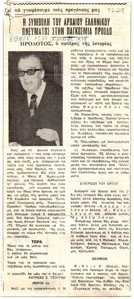 Απόκομμα, χαρτί, 2 φφ, στα ελληνικά. Δημοσίευση άρθρου το οποίο αναφέρεται στον ιστορικό της αρχαιότητας, Ηρόδοτο. Δίνονται λεπτομέρειες για το έργο που άφησε.