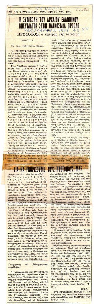 Απόκομμα, χαρτί, 36×11 εκ., στα ελληνικά. Δημοσίευση άρθρου το οποίο αναφέρεται στον ιστορικό της αρχαιότητας, Ηρόδοτο. Ειδικότερα, δίνονται λεπτομέρειες για την συγγραφή της ιστορίας του.