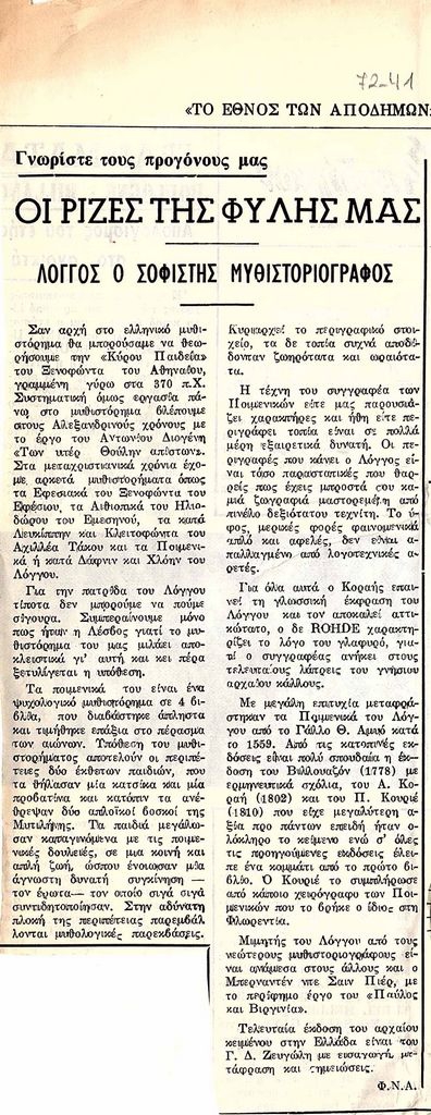 Απόκομμα, χαρτί, στα ελληνικά. Δημοσίευση άρθρου το οποίο αναφέρεται στον μυθιστοριογράφο της αρχαιότητας, Λόγγο. Δίνονται λεπτοέρειες για τη ζωή του.