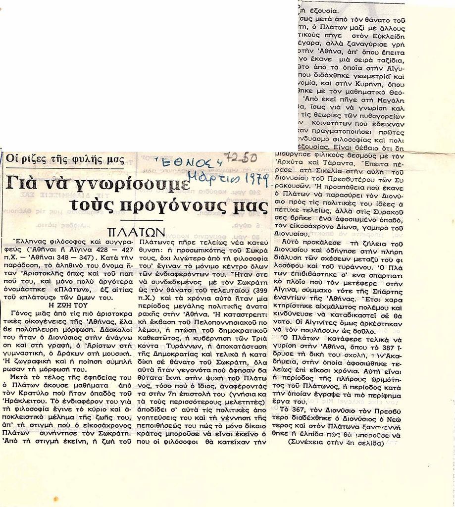 Απόκομμα, χαρτί ακανόνιστου μεγέθους, στα ελληνικά. Δημοσίευση άρθρου το οποίο αναφέρεται στον φιλόσοφο Πλάτωνα.