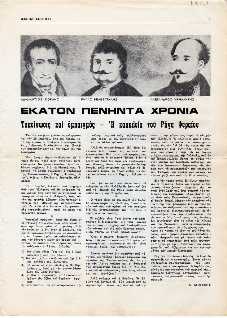 Απόκομμα, χαρτί, 31 x 22 εκ., δημοσίευσης άρθρου το οποίο αναφέρεται στην επέτειο συμπλήρωσης 150 χρόνων από την Ελληνική Επανάσταση. Αναγράφονται σκέψεις σχετικά με τη σημασία του Αγώνα το δημοκρατικό ιδεώδες.