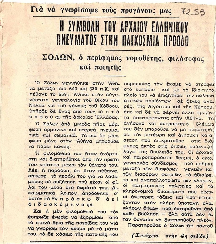 Απόκομμα, Η συμβολή του αρχαίου ελληνικού πνεύματος στην παγκόσμια πρόοδο. Σόλων, ο περίφημος νομοθέτης, φιλόσοφος και ποιητής, ΤΟ ΕΘΝΟΣ (6 φφ).