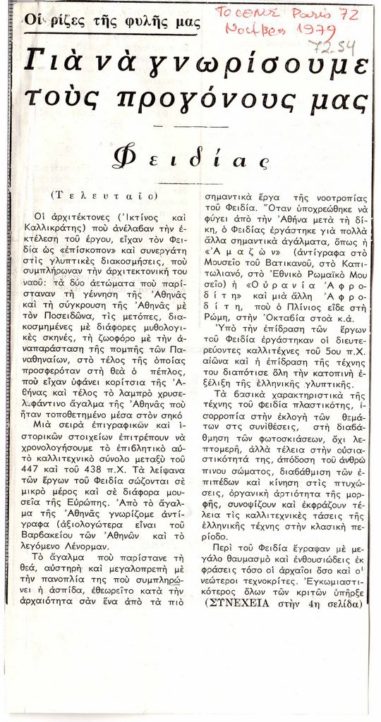 Απόκομμα, χαρτί, 2 φφ, στα ελληνικά. Δημοσίευση άρθρου το οποίο αναφέρεται στον γλύπτη της αρχαιότητας, Φειδία. Δίνονται λεπτομέρειες για τη ζωή και το έργο του.